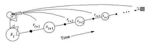 相比于动态规划的方法,蒙特卡罗的方法需要等到每次试验结束,所以学习速度慢,学习效率不高。很自然的,可以想到借鉴动态规划中bootstrapping的方法,在不等到试验结束时就估计当前的值函数。事实上,这就是时间差分方法的精髓。时间差分方法结合了蒙特卡罗的采样方法(即做试验)和动态规划方法的bootstrapping(利用后继状态的值函数估计当前值函数),其示意图如下
