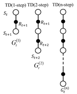 G t ( n ) = R t + 1 + γ R t + 2 + ⋯ + γ n − 1 R t + n + γ n V ( S t + n ) G_{t}^{(n)}=R_{t+1}+\gamma R_{t+2}+\cdots+\gamma^{n-1} R_{t+n}+\gamma^{n} V\left(S_{t+n}\right) Gt(n)=Rt+1+γRt+2+⋯+γn−1Rt+n+γnV(St+n)