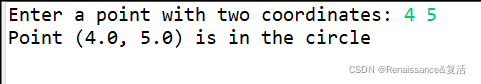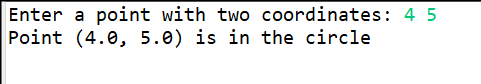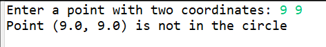 package pack2;import java.util.Scanner;public class InCircle {public static void main(String[] args) {try(Scanner input = new Scanner(System.in);) {System.out.print("Enter a point with two coordinates: ");double x = input.nextDouble();double y = input.nextDouble();System.out.printf("Point (%.1f, %.1f) is "+(isInCircle(x, y) ? "" : "not ")+"in the circle", x, y);}}//判定是否在圆中public static boolean isInCircle(double x, double y) {return Math.sqrt(Math.pow(x, 2) + Math.pow(y, 2)) <= 10;}