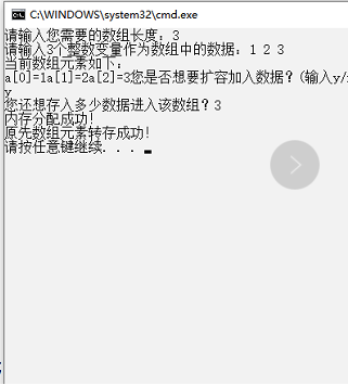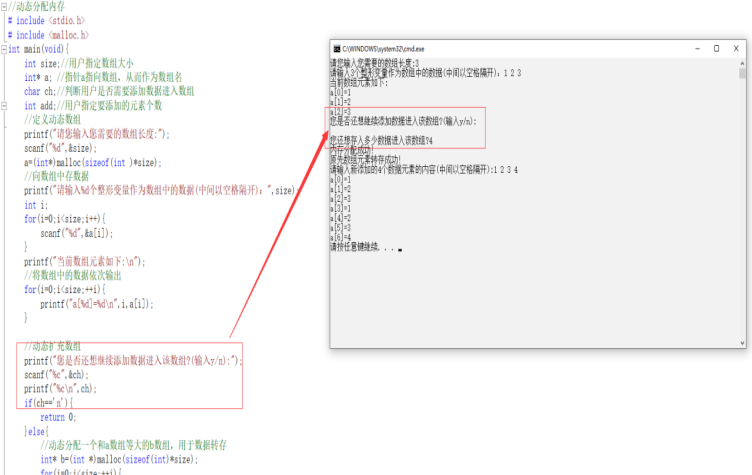 int main(){int size;int *a;char ch[20];int add;printf("请输入您需要的数组长度:");scanf("%d",&size);//动态分配用户指定大小的数组空间a=(int*)malloc(sizeof(int)*size);printf("请输入%d个整数变量作为数组中的数据:",size);int i;for(i=0;i