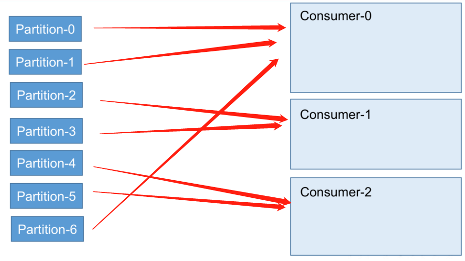 按照范围划分,7/3=2,以每两个分区为一组分配,最后一个分区6单独分配给consumer-0。 特点: 适合各分区内数据均匀情况
