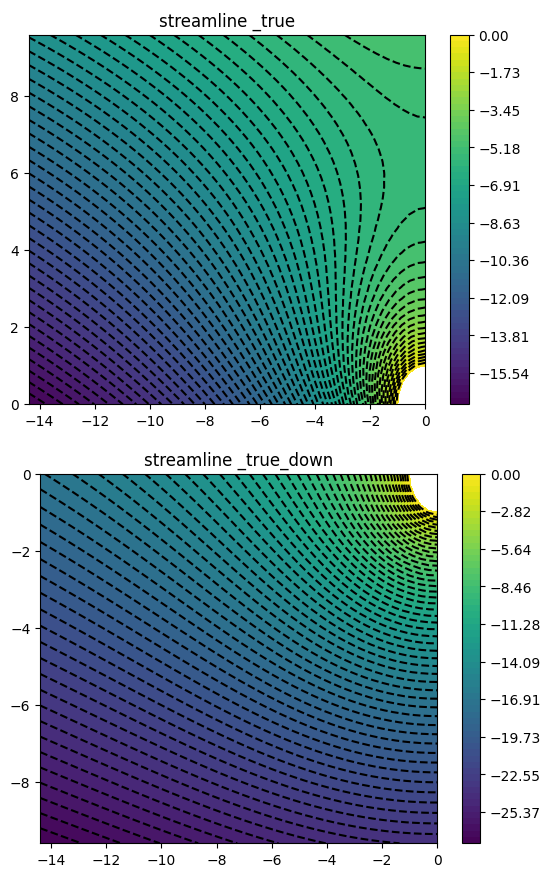 可以看到,对于有特定方向环量的圆柱绕流,上半区域存在驻点,数值解与解析解的流线差别较大 ,下半区域数值解与解析解的流线差别较小;随着外边界距离的扩大,外部区域受到点涡的影响减小,数值解与解析解变得更加接近,在左边界处和上边界处观察尤为明显。