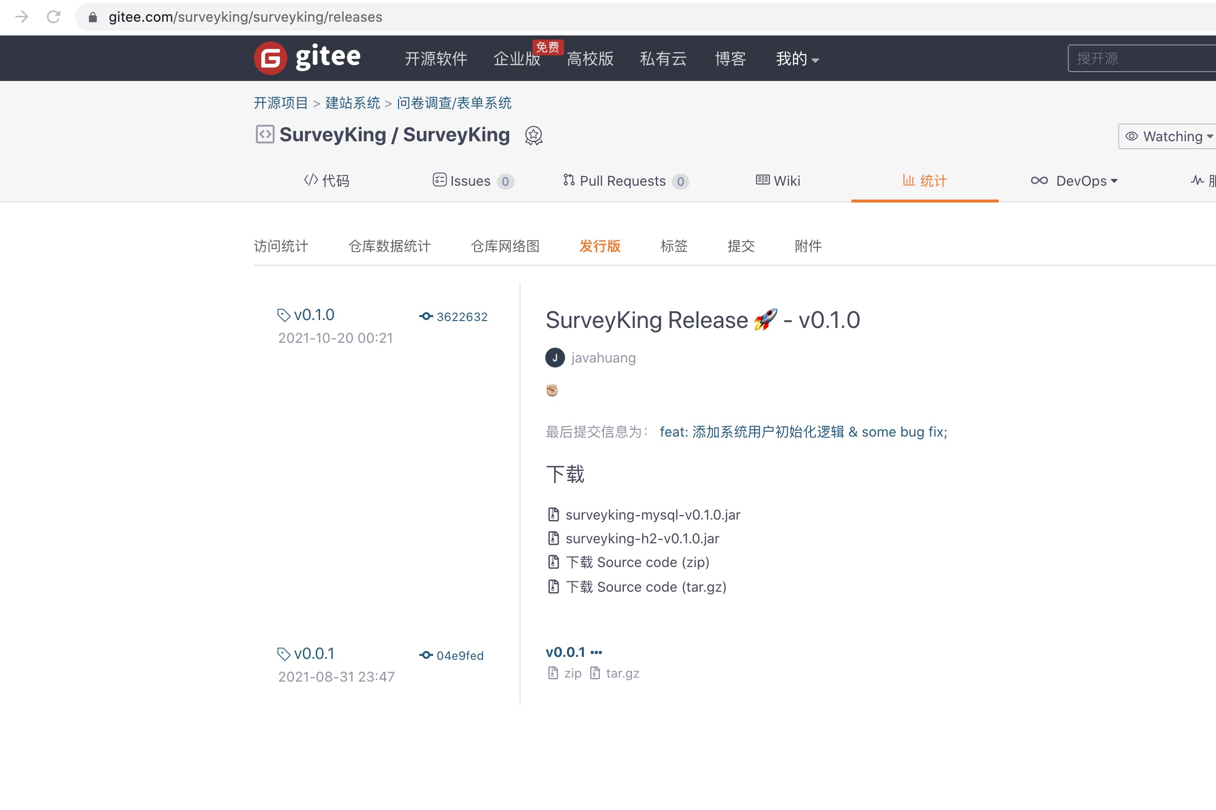 首先进入卷王调查问卷系统的最新版本发布页面,点击下载最新的版本, surveyking-h2-vx.x.x.jar