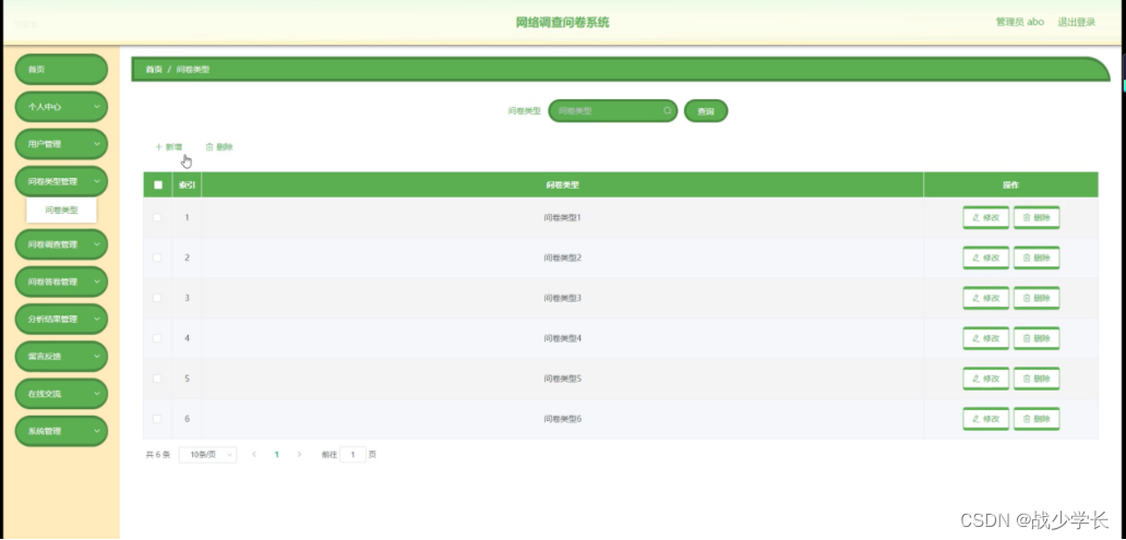 问卷类型管理,在问卷类型管理页面可以对索引、问卷类型等内容进行修改和删除等操作,如图5-9所示。