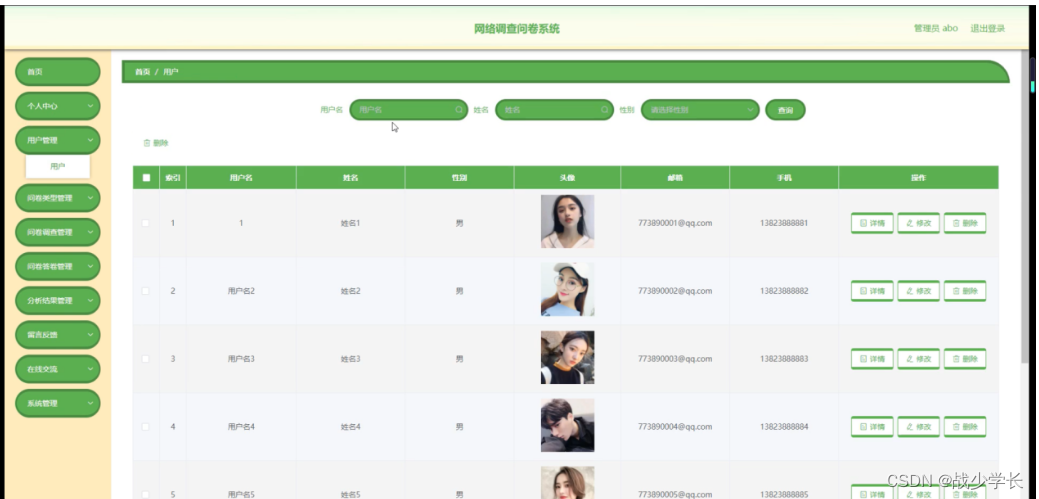 用户管理,在用户管理页面可以对索引、用户名、姓名、性别、头像、邮箱、手机等内容进行详情,修改和删除等操作,如图5-8所示。