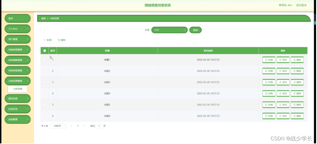 分析结果管理,在分析结果管理页面可以对索引、标题、发布时间等内容进行详情,修改和删除等操作,如图5-12所示。
