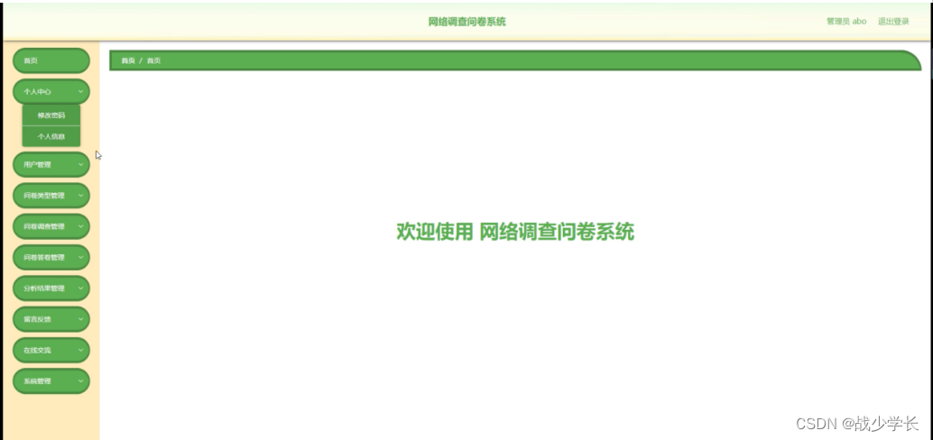 管理员登录系统后,可以对首页、个人中心、用户管理、问卷类型管理、问卷调查管理、问卷答卷管理、分析结果管理、留言反馈、在线交流、系统管理等进行相应的操作管理,如图5-7所示。