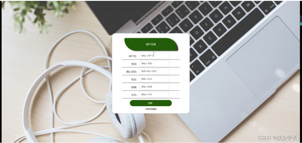 用户注册,在用户注册页面通过填写用户名、密码、确认密码、姓名、邮箱、手机等内容进行用户注册等操作,如图5-5所示。