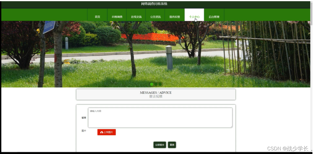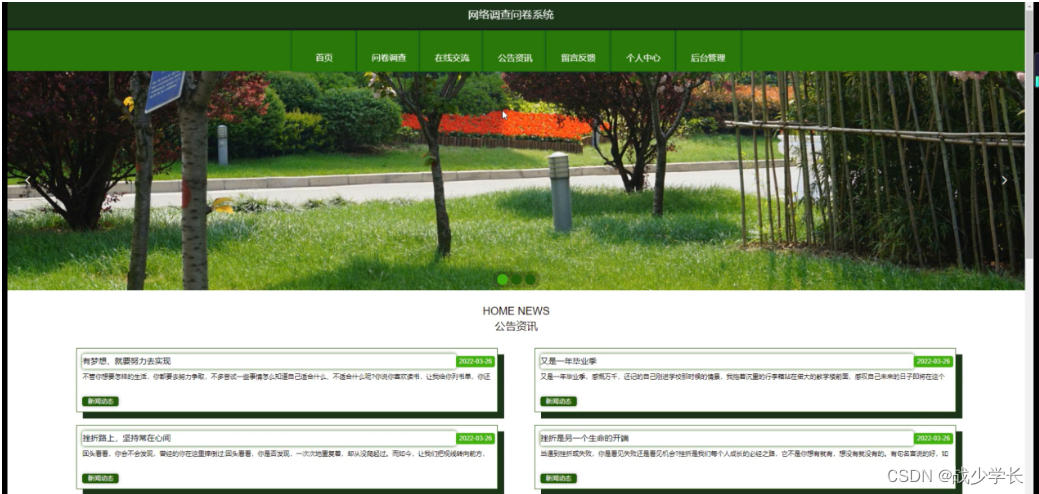 网络调查问卷系统,在系统首页可以查看首页、问卷调查、在线交流、公告资讯、留言反馈、个人中心、后台管理等内容,并进行详细操作,如图5-1所示。