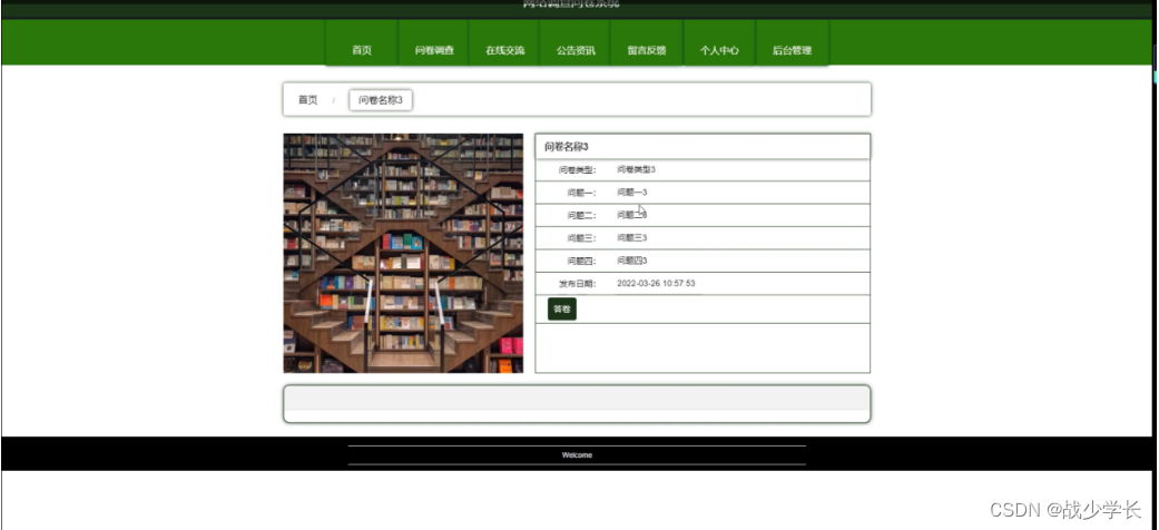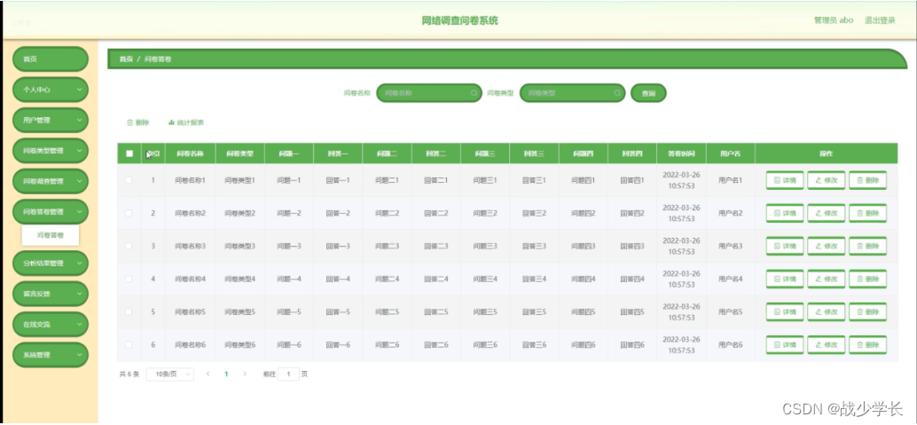 问卷调查,在问卷调查页面可以查看首页、问卷名称、问卷类型、问题一、问题二、问题三、问题四、发布日期、图片等内容,根据需要对答卷进行详细等操作,如图5-2所示。