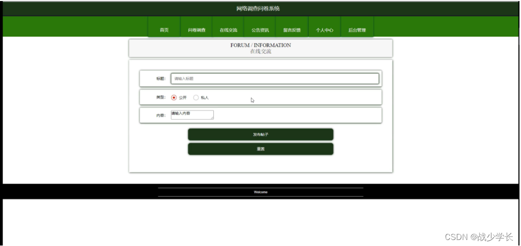 在线交流,在在线交流页面通过填写标题、类型、内容等内容并进行发布帖子或重置等操作,如图5-3所示。