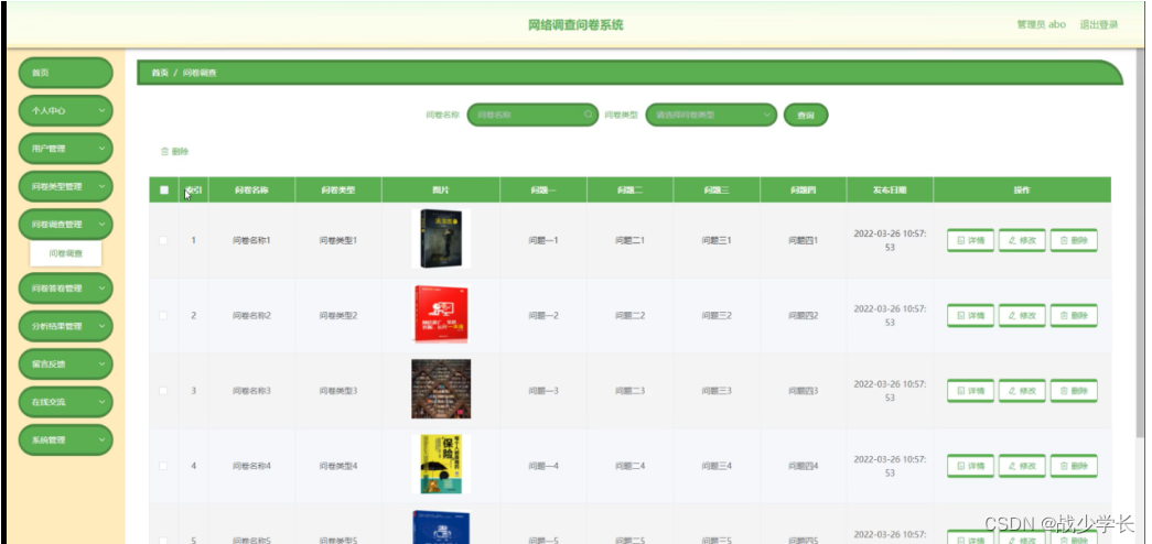 问卷调查管理,在问卷调查管理页面可以对索引、问卷名称、问卷类型、图片、问题一、问题二、问题三、问题四、发布日期等内容进行详情,修改和删除等操作,如图5-10所示。