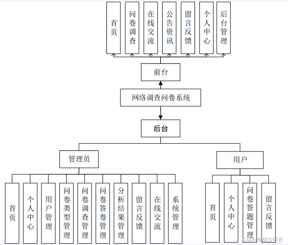通过前面的功能分析可以将网络调查问卷系统的功能分为管理员和用户两个部分,系统的主要功能包括首页、个人中心、用户管理、问卷类型管理、问卷调查管理、问卷答卷管理、分析结果管理、留言反馈、在线交流、系统管理等内容。任何用户只要进入网站不需登录也可浏览到的信息,后台管理是针对已登录的用户看到满意的问卷调查信息而设计的。