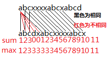 for(register int i=0; i<=strlen(b); i++) {for(register int j=0; j<=strlen(a); j++) {if(a[j]==b[i]) {sum=1;for(register int k=1;k<=strlen(a)-j;k++){if(a[j+k]==b[i+k]){sum++;}else{j+=k;break;}}maxx=max(maxx,sum);} else{y=0;}}}