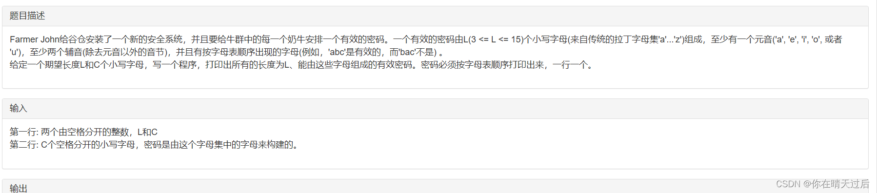 #includeusing namespace std; const int N = 1e3 + 10; int n,m,t; char wd[N];//用来存储输出的字符 char ab[N];//用来存储所有的字符 bool f[N];//判断这个字符是否背使用过 bool func(char ch[],int len){int ans = 0,cnt = 0;for(int i=0;i >m>>n;for (int i = 0; i < n; ++i) {cin>>ab[i];}sort(ab,ab+n);//因为题目是按照字典序排序,那么我们只需要把所有字符先排序再进行dfs即可dfs(0,0);return 0; }