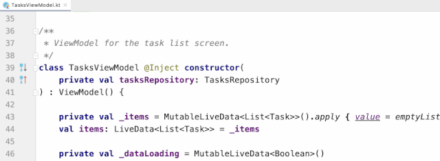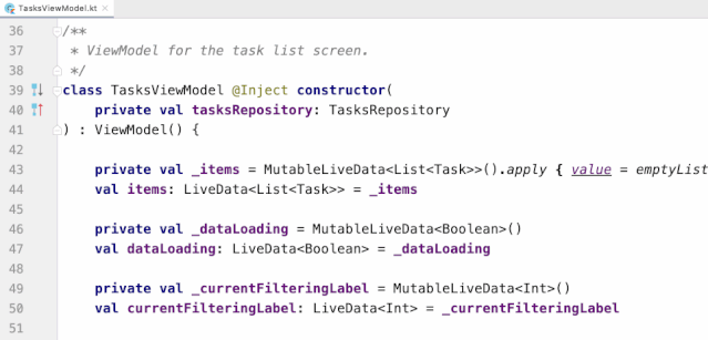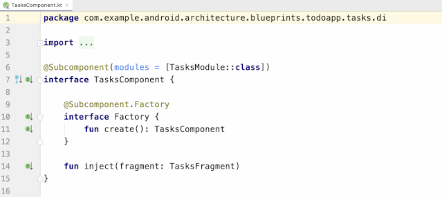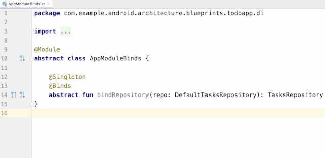 在下面的例子中,TasksViewModel 依赖了 TasksRepository。点击间距图标即可跳转到 AppModuleBinds 类中提供 TasksRepository 对象的 @Bind 方法: