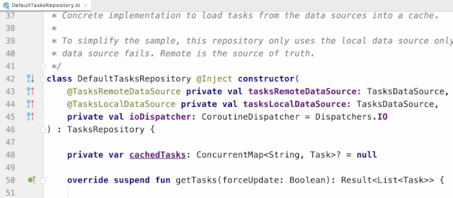 DefaultTasksRepository 依赖了被限定符修饰的 TasksDataSource。点击间距图标将跳转到 AppModule 中使用限定符提供对应类型的方法。