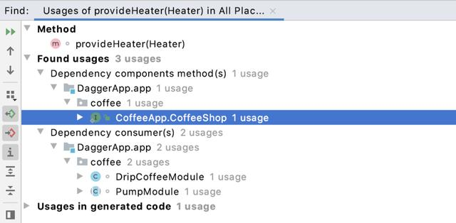 正如您所看到的,在 Android 应用中 Dagger 关系的导航从未如此简单。新版本 Android Studio 将支持一键精确查找提供依赖项方法的功能。