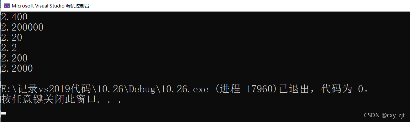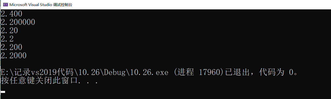 {float a = 2.2;double b = 2.4;printf("%.3f\n", b);printf("%f\n", a);printf("%.2f\n", a);printf("%.1f\n", a);printf("%.3f\n", a);printf("%.4f\n", a);return 0;