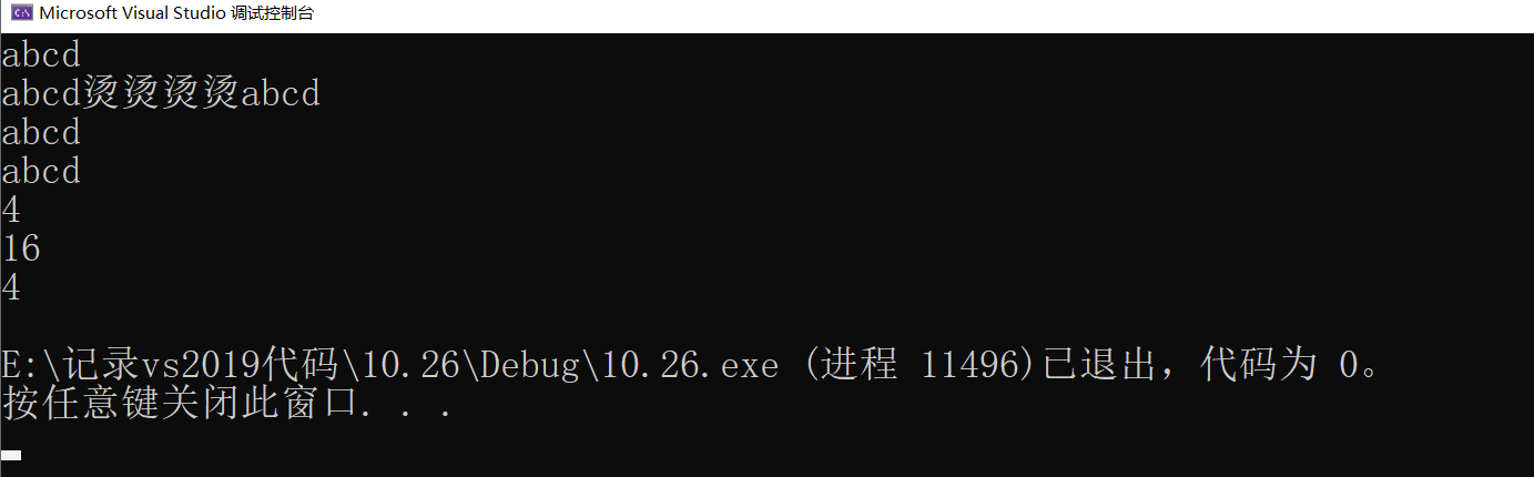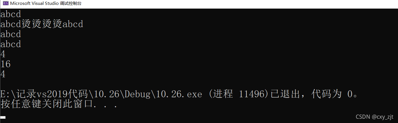 int main() {char zjt[] = "abcd";//字符串1char dy[] = { 'a','b','c','d' };//字符串2char dsg[] = { 'a','b','c','d','\0' };//字符串3char dagg[5]= { 'a','b','c','d' };//字符串4printf("%s\n%s\n%s\n%s\n", zjt, dy, dagg,dsg);printf("%d\n%d\n%d\n", strlen(zjt),strlen(dy),strlen(dsg));return 0;