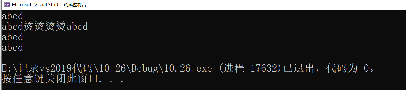 int main() {char zjt[] = "abcd";//字符串1char dy[] = { 'a','b','c','d' };//字符串2char dsg[] = { 'a','b','c','d','\0' };//字符串3char dagg[5]= { 'a','b','c','d' };//字符串4printf("%s\n%s\n%s\n%s\n", zjt, dy, dagg,dsg);return 0;
