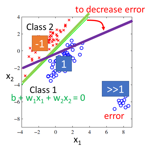 以二分类为例,把种类当成数值, (0为分界)输出接近1则取类1, 输出接近-1则取类2.