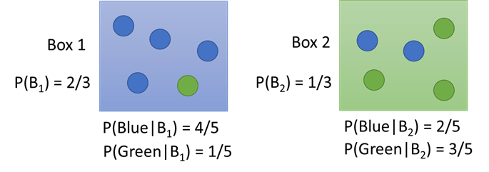 $$ P\left( B1~ \middle| ~Blue \right) = \frac{P\left( {\text{Blue}\left| B_{1} \right.} \right)P\left( B_{1} \right)}{P\left( {\text{Blue}\left| B_{1} \right.} \right)P\left( B_{1} \right) + P\left( {\text{Blue}\left| B_{2} \right.} \right)P\left( B_{2} \right)} $$