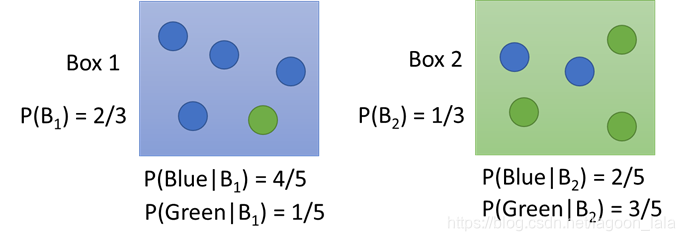 已知两个盒子中球数( 盒1 蓝球占4/5, 绿占1/5; 盒2蓝球占2/5, 绿占3/5), 从盒1抽的几率是2/3, 从盒2抽的几率是1/3, 拿出发现是蓝球, 分别求从盒1盒2拿的概率.