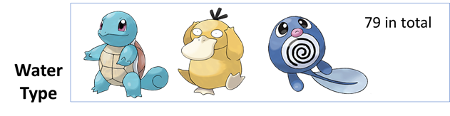 在Training data里面,有79只水系宝可梦(杰尼龟, 可达鸭, 蚊香蝌蚪…),61只一般系宝可梦.