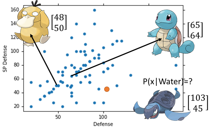 把高斯(高维正态)分布看成一个函数, 其输入为一个向量x, 输出的是某宝可梦在该分布的概率密度 (与被抽样的概率成正比):