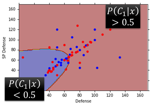 $$ P\left( C_{1} \middle| x \right) = \frac{P\left( x \middle| C_{1} \right)P\left( C_{1} \right)}{P\left( x \middle| C_{1} \right)P\left( C_{1} \right) + P\left( x \middle| C_{2} \right)P\left( C_{2} \right)} \\ If P(C_1 |x)>0.5, output: class 1\\ Otherwise, output: class 2 $$