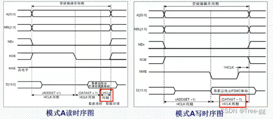 STM32的FSMC存储块1支持的异步突发访问模式包括:模式1、模式A~D等多种时序模型,驱动SRAM时一般使用模式1或者模式A,这里我们使用模式A来驱动LCD(当SRAM用),其他模式说明详见: STM32中文参考手册-FSMC章节。