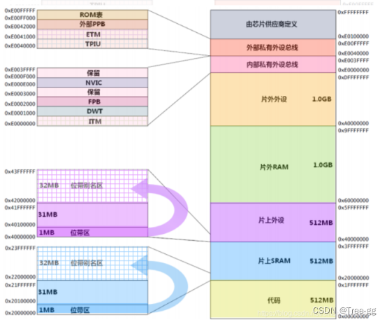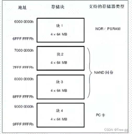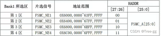 STM32的FSMC存储块1 (Bank1)用于驱动NOR FLASH/SRAM/PSRAM,被分为4个区,每个区管理64M字节空间,每个区都有独立的寄存器对所连接的存储器进行配置。Bank1的256M字节空间由28根地址线(HADDR[27:0])寻址。这里HADDR,是内部AHB地址总线,其中, HADDR[25:0]来自外部存储器地址FSMC_A[25:0],而HADDR[26:27]对4个区进行寻址。这里的意思是HADDR的0位到25位地址总线可以访问大小是64M然后26位和27位决定访问256M里面的哪一个64M,可以理解为外部可以接4个64M的SRAM,地址是从0x60000000开始26位和27位0,如果26和27位是1,则内存地址偏移64M以此类推。