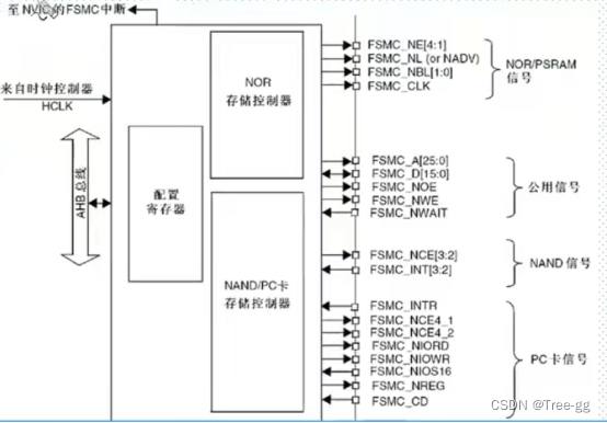 FSMC,即灵活的静态存储控制器,能够与同步或异步存储器和16位PC存储器卡连接, STM32的FSMC接口支持包括SRAM, NAND FLASH, NOR FLASH和PSRAM等存储器。FSMC的框图如下图所示:
