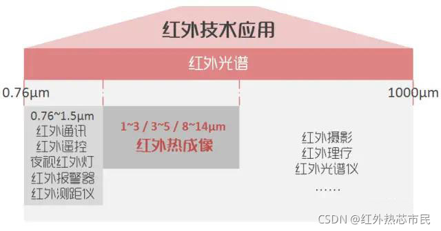 红外线波长从0.76μm至1000μm,其间不同波段的红外线拥有不同的特性,因此也有不同的应用,如红外热成像、红外遥控、红外通讯、红外摄影、红外理疗等等。(千万不能将它们混为一谈哦~)