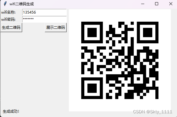 def Wifi_QR_code():Wifi_ID = txtName.get()Wifi_password = txtPassword.get()# ssid:指的是WiFi的账号 # password:指的是WiFi的密码 # security: 指的是WiFi的加密方式 # hidden: WiFi是否隐藏 # scale: 二维码的像素QR = helpers.make_wifi(ssid=Wifi_ID, password=Wifi_password, security="WPA", hidden=False)QR.save("wifi.png", scale=10)label1 = Label(Login_interface, text='生成成功!')label1.place(x=5, y=320)Login_interface.mainloop()# 展示wifi图片