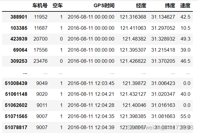 字段: 车机号,空车(1空车 0非空车),GPS时间,经度,纬度,速度 数据量: 单日5g左右 注: 图中为8月11号的数据样例
