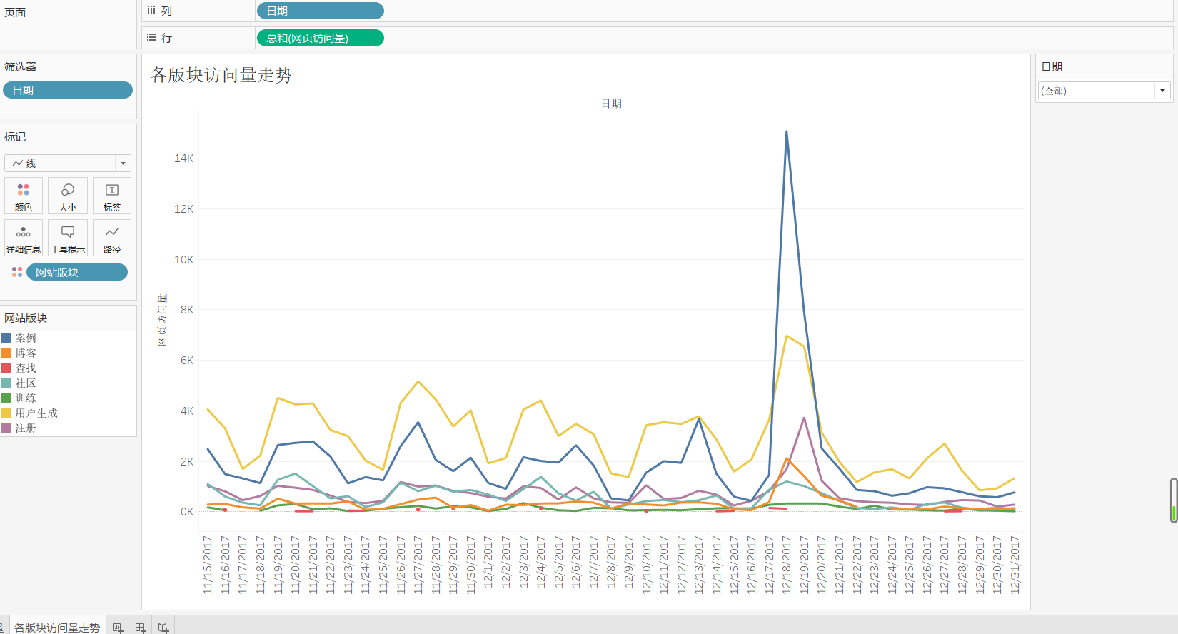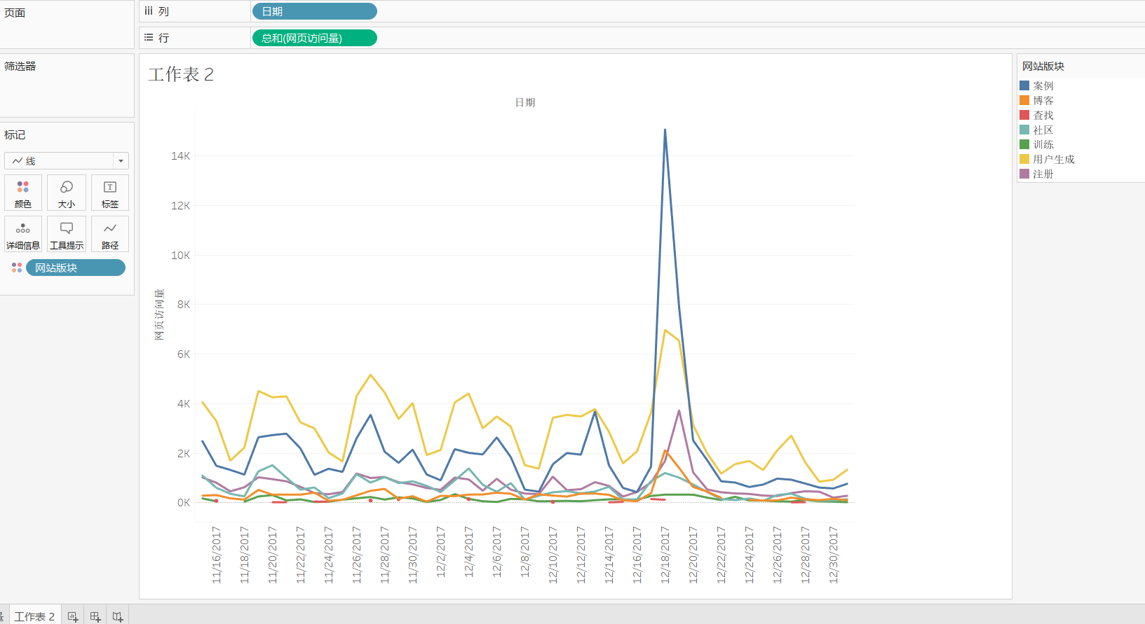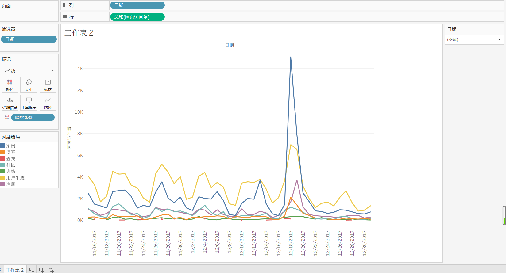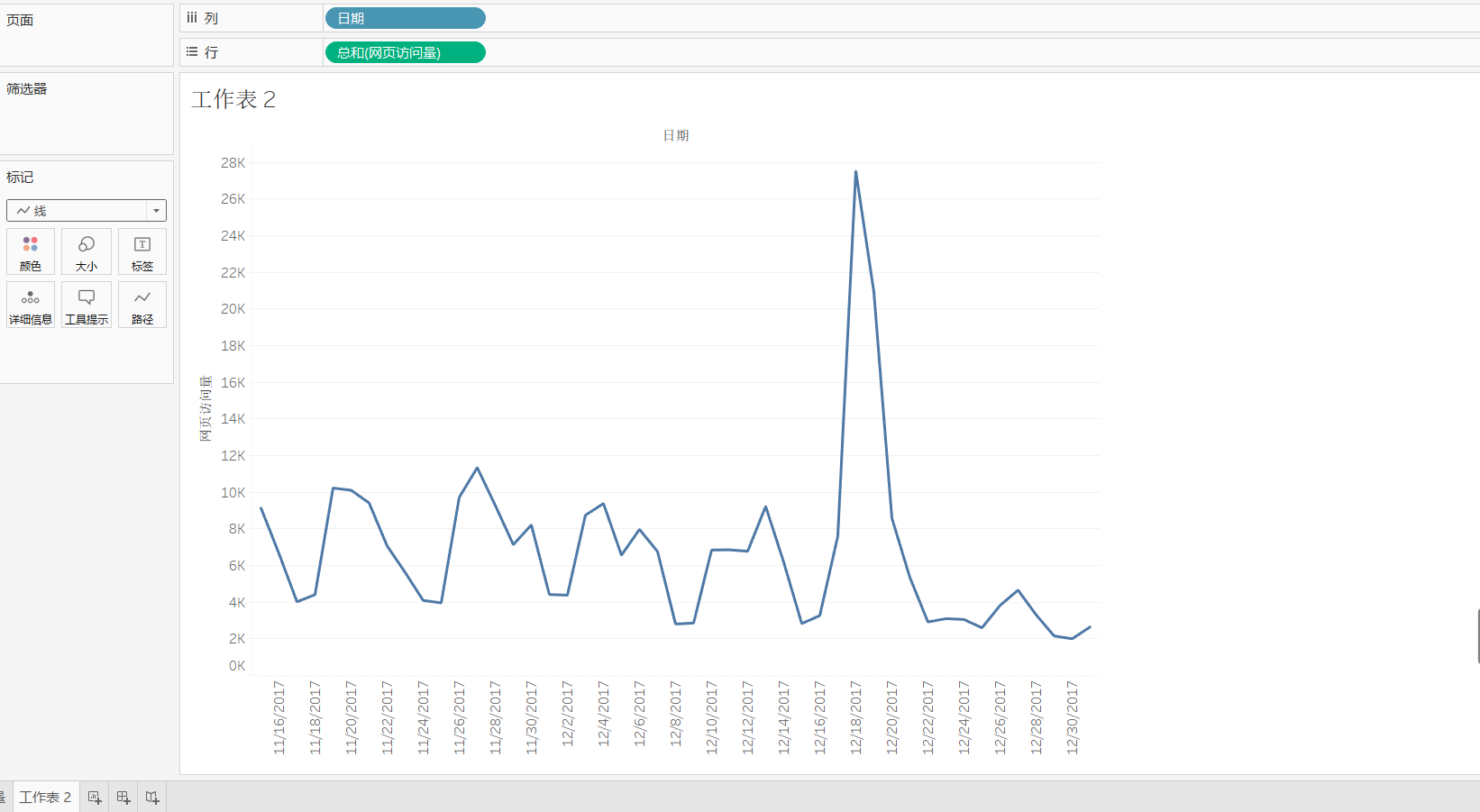 a.将日期放入列,将网页访问量放入行;将标记选择为线。