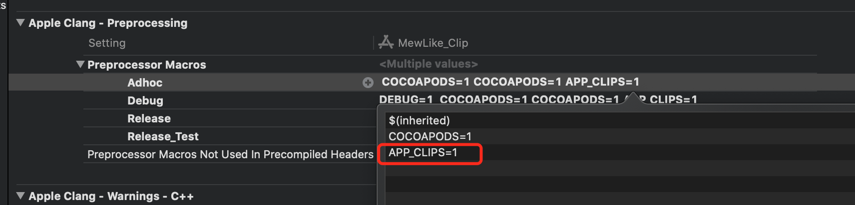 如果代码不在pod组件内的话,只需要在Clip Target的Build Settings - Preprocessor Macros添加APP_CLIPS宏即可。