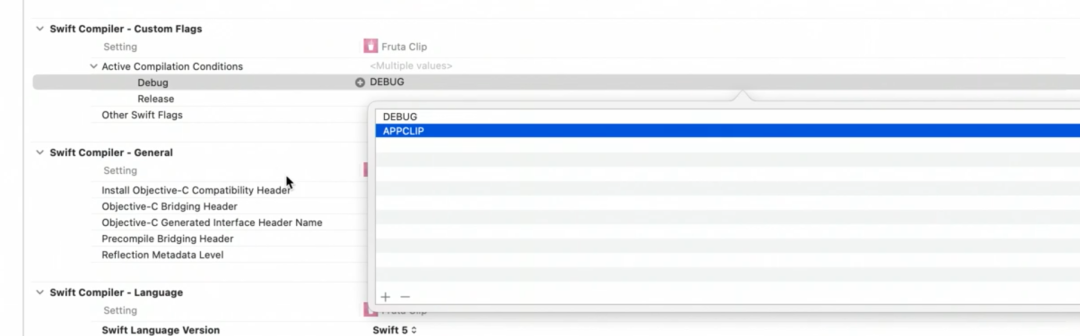 这里涉及到共用代码不同平台的区分处理问题,因此我们需要为 Clip target 的 Debug 和 Release 配置项中添加一个 APPCLIP 宏,如下所示: