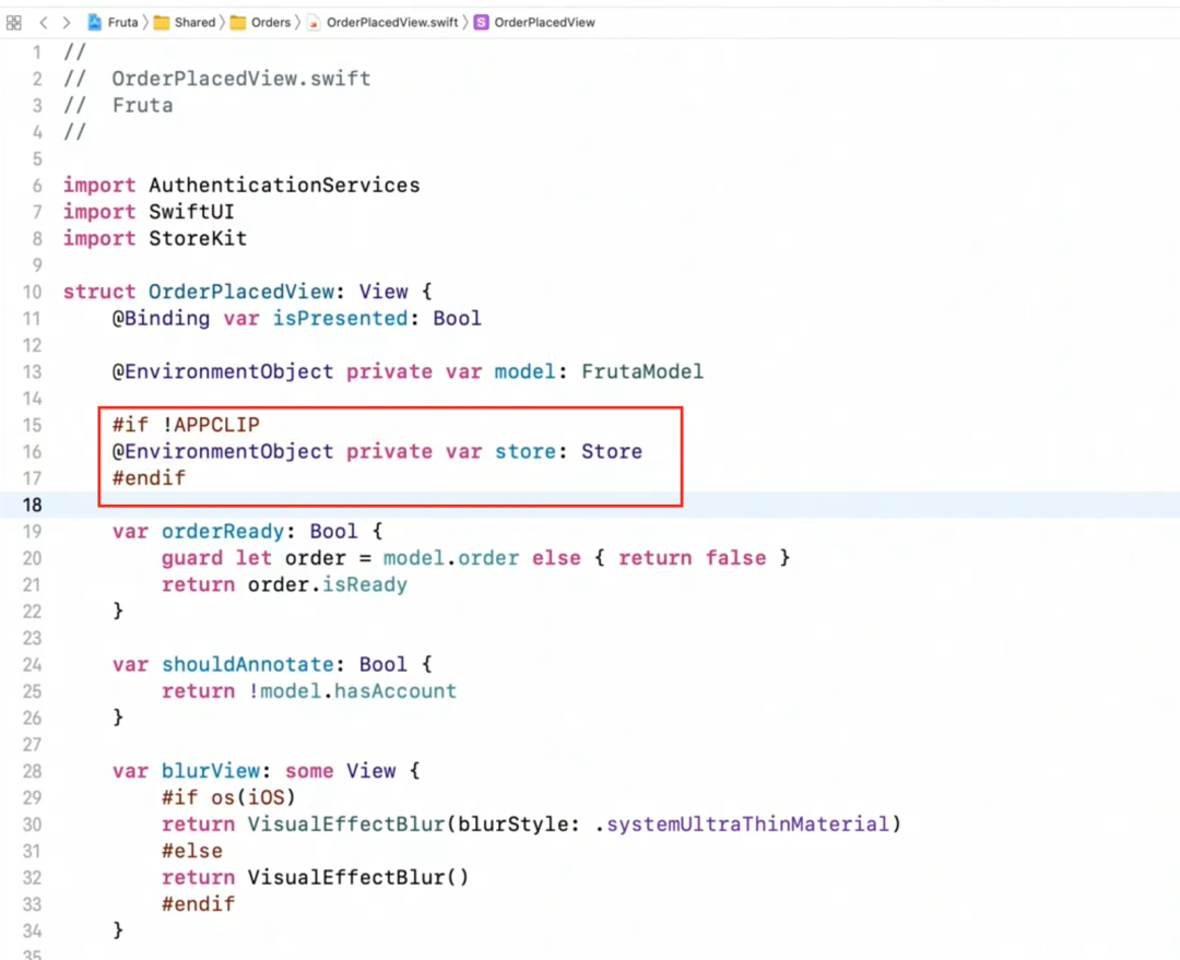 struct FrutaApp: App {@StateObject private var model = FrutaModel()#if !APPCLIP@StateObject private var store = Store()#endif@SceneBuilder var body: some Scene {WindowGroup {#if APPCLIPNavigationView {SmoothieMenu()}.environmentObject(model).onContinueUserActivity(NSUserActivityTypeBrowsingWeb, perform: handleUserActivity)#elseContentView().environmentObject(model).environmentObject(store)#endif}}#if APPCLIPfunc handleUserActivity(_ userActivity: NSUserActivity) {guard let incomingURL = userActivity.webpageURL,let components = NSURLComponents(url: incomingURL, resolvingAgainstBaseURL: true),let queryItems = components.queryItems else {return}if let smoothieID = queryItems.first(where: { $0.name == "smoothie" })?.value {model.selectSmoothie(id: smoothieID)}guard let payload = userActivity.appClipActivationPayload,let latitudeValue = queryItems.first(where: { $0.name == "latitude" })?.value,let longitudeValue = queryItems.first(where: { $0.name == "longitude" })?.value,let latitude = Double(latitudeValue), let longitude = Double(longitudeValue) else {return}let region = CLCircularRegion(center: CLLocationCoordinate2D(latitude: latitude,longitude: longitude), radius: 100, identifier: "smoothie_location")payload.confirmAcquired(in: region) { inRegion, error inif let error = error {print(error.localizedDescription)return}DispatchQueue.main.async {model.applePayAllowed = inRegion}}}#endif