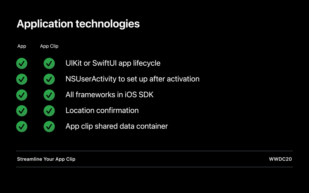 从下图来看,主应用程序和 App Clip 对比来看共性很多,因此对于 iOS 开发者来说,开发 App Clip 就是 A piece of cake ????。
