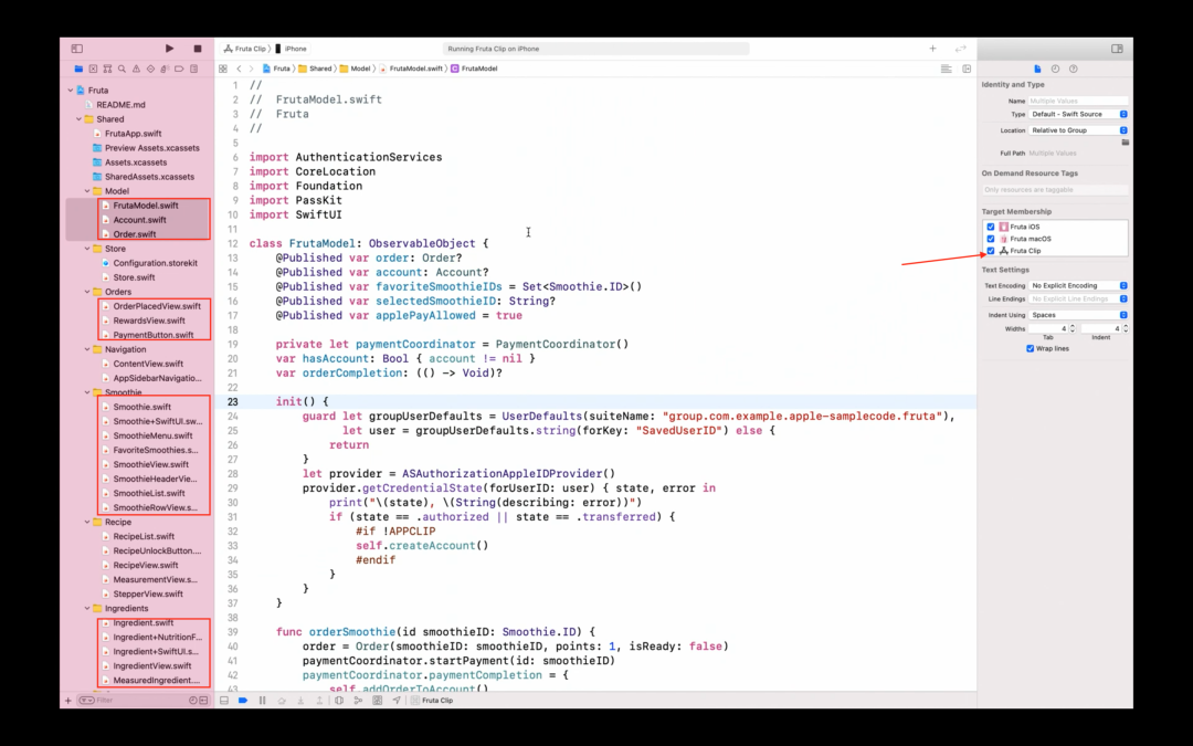 接着我们要为 App Clip Target 按需「添加」主应用中已经实现的类、文件或是整个模块,对于文件来说,只需要在 Target Membership 中勾选上 Clip target 即可。