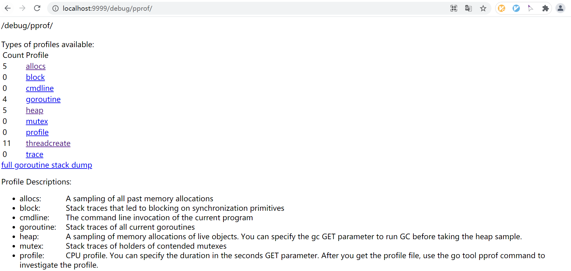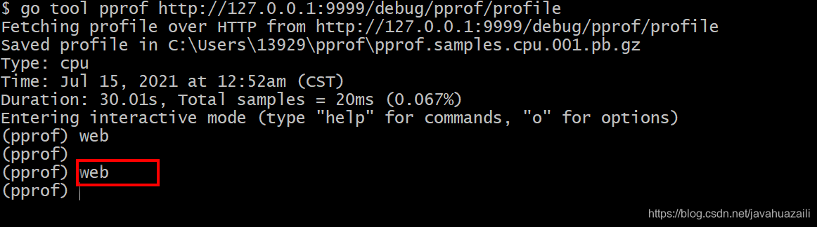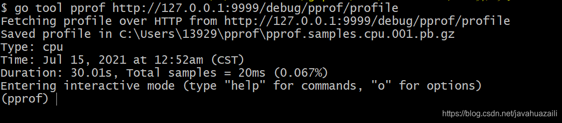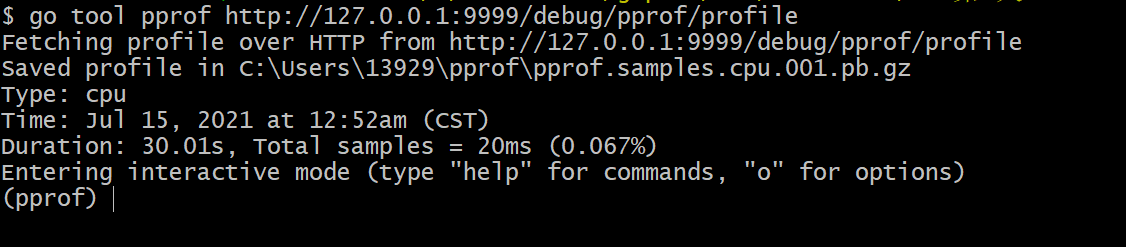 go tool pprof http://127.0.0.1:9999/debug/pprof/profile