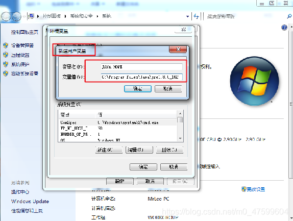 2.新建用户变量,变量名:JAVA_HOME,变量值:jre的目录。