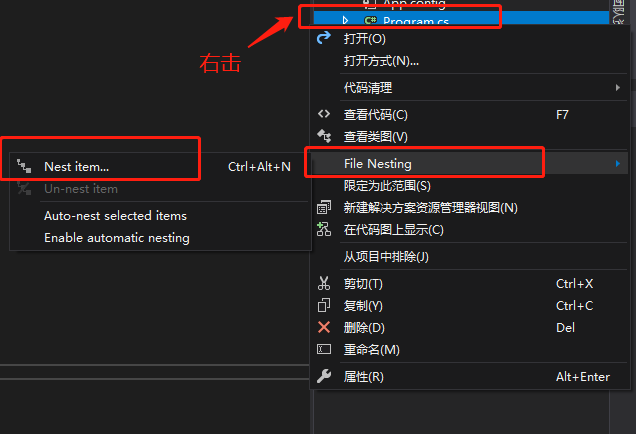 2)选中app.config,右击,选择File Nesting,点击Nest item;