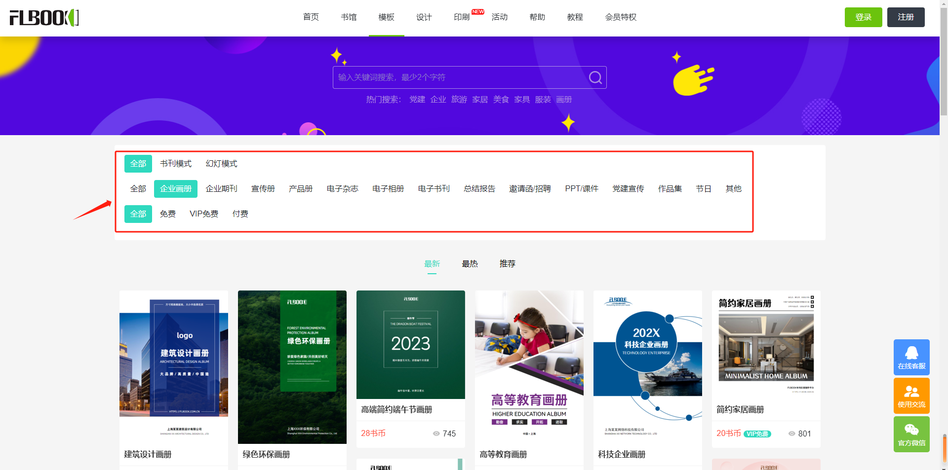 2.点击开始创作,如果是零基础的小白又想轻松制作炫酷的效果,可以选择套用模板制作电子画册,平台有多种风格的模板,可以根据个人需求进行挑选使用;
