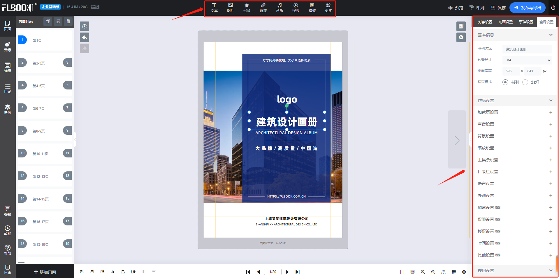 3.来到编辑界面,编辑器简洁明了,无论你是小白还是资深设计师,都能轻松拿捏使用,除了把模板里的内容替换成自己的内容后,还可以给电子画册添加一些背景音乐、视频、表格、链接、或是文字动画等效果;