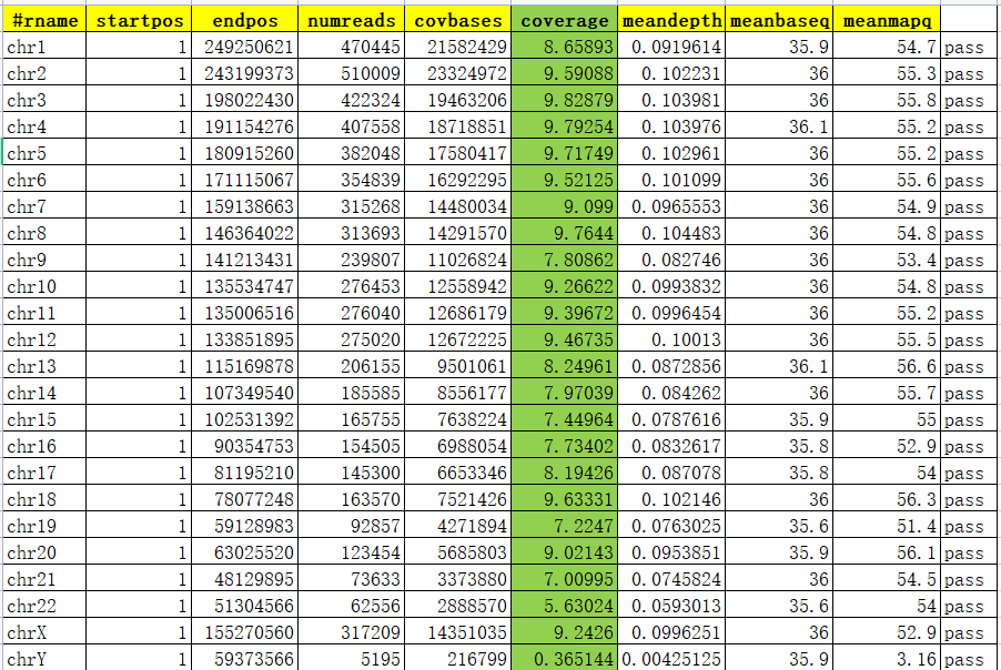 对样本通过序列碱基质量控制的数据进行比对分析,仅保留唯一比对、去除重复的比对结果,统计每一条染色体的覆盖深度,认为染色体覆盖深度至少>=0.16x的数据分析结果可靠。