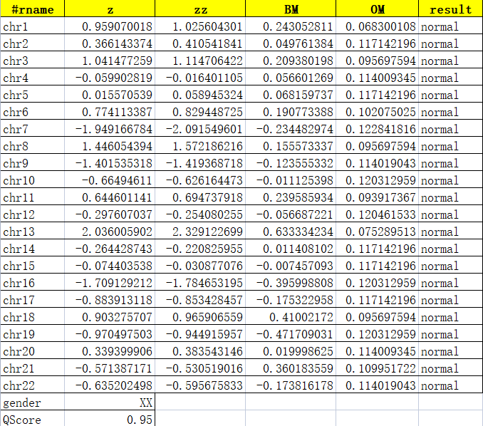 样本染色体的统计值列表、性染色体判别结果、质量值QScore ,其中QScore 越小越好, QScore>2 需重采样;QScore <1.5 通过。
